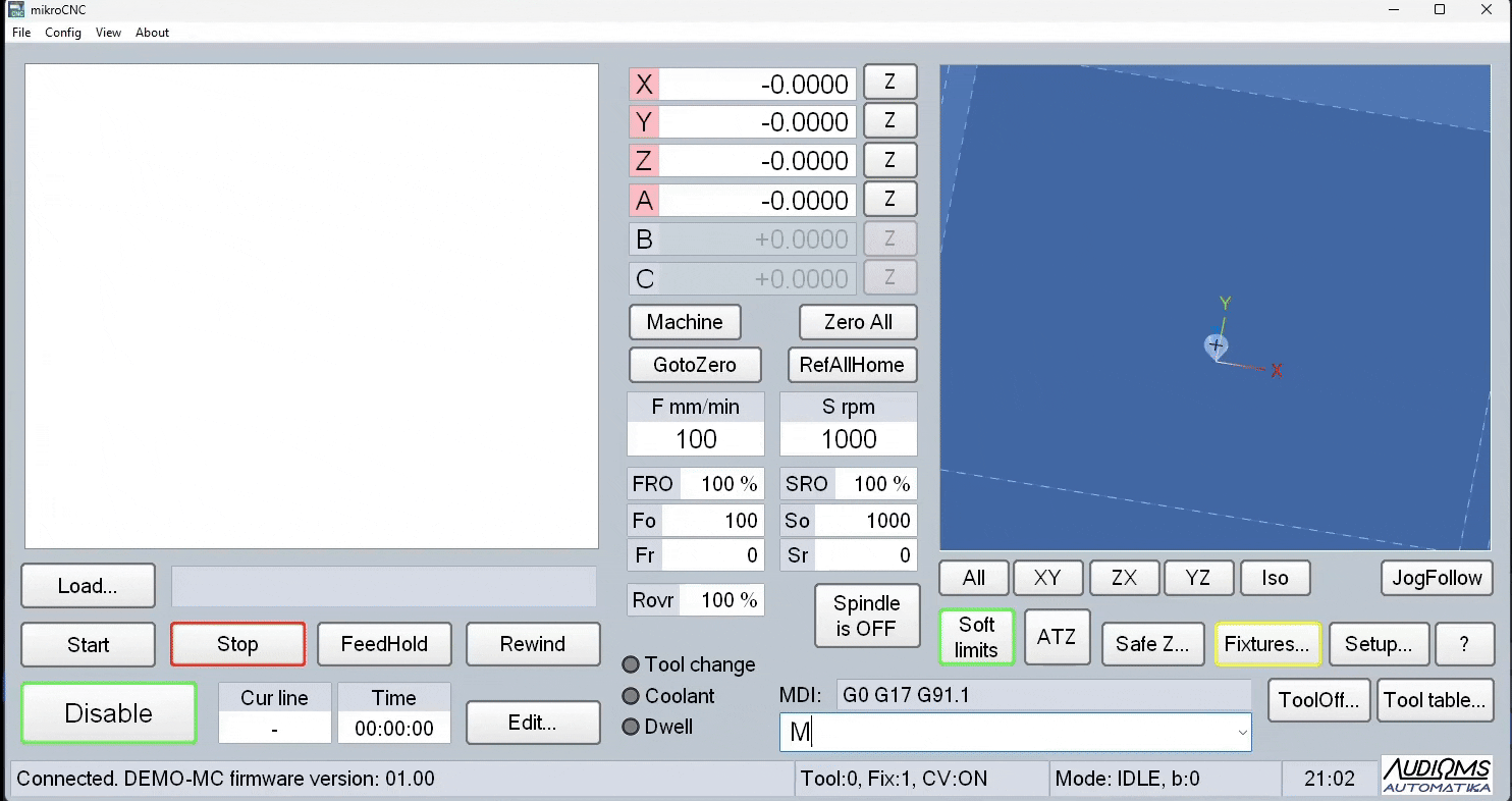 mikroCNC je besplatan softver koji interpretira standardne G i M kod komande i pretvara računar u CNC upravljačku jedinicu. Radi pod Windows XP/Vista/7/8/8.1/10/11 sa 32-bitnom ili 64-bitnom arhitekturom.