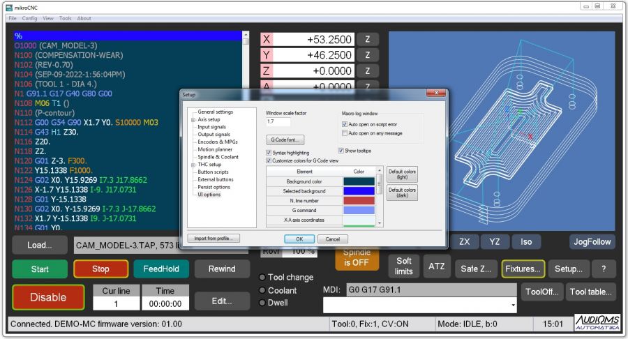 - Podešavanje boja za prozor koji prikazuje g-kod